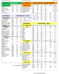 - Kalorické tabulky potravin - 25 stránek formátu A4; v tabulkách je u potravin uvedeno množství energie, bílkovin, sacharidů, tuků, vlákniny, cholesterolu a glykemický index.